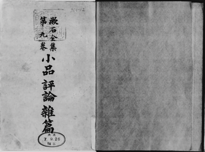 兹告:漱石全集第七回配本第九卷延期甚久,终得于本月十日起陆续寄送,方感宽慰。不意发现该书第六八一页与六八三页装订错乱,惊悉之下惶惧无措。此全系筑地活版制造所之责,出版会亦无颜面对诸会员。虽曾考虑重印错页改装弥补,然恐反损书籍美观,况已寄送之书若再烦请邮寄返还,书籍恐因多次递送严重损毁。百般筹谋无果,唯具陈实情乞请诸会员海涵。前述两页正确印页将于第八回配本时随附寄奉。倘仍有会员坚持要求重新装订,烦请知悉上述情由后寄还该书,敝处定当遵嘱办理。前次延期未已,今复铸大错,出版会实不知有何等致歉之言辞,惟祈诸位体察情由,予以宽宥,伏惟恳请。