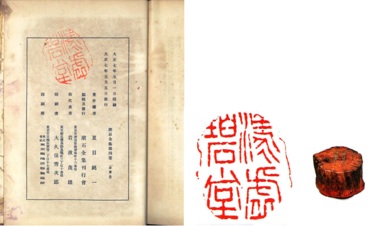 检印是指作者在版权页加盖印章,以示授权的意思。矢野进也指出,《漱石全集》采用刻有“漾虚碧堂”字样的不规则印章(约60×45毫米,石材短小难持)。“漾虚碧堂”据说是漱石自1896年左右开始使用的书斋名,源自宋代禅僧雪窦重显的诗:“春山叠乱青,春水漾虚碧。”由于全集未使用专用印纸,而是直接钤于版权页,故需单独印刷版权页后装订时粘贴。长田幹雄、小林勇等少年店员常轮班携印好的版权页前往早稻田南町漱石山房。二人合作钤盖“漾虚碧堂”印常需整日,清点数量经确认后方才带回。从初版至第三版,每卷皆依此规程制作。
